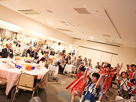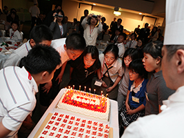 第2日目はキッザニア甲子園にて職業体験を行い、夜はクラブ主催の歓迎レセプションを行いました。合唱や古楽器によるミニコンサート、更には大川小学校児童による大川ソーランの披露と、宴は終始和やかに進められ、終盤にはクラブメンバーで株式会社エーデルワイスの比屋根毅会長よりのサプライズで、歓迎のメッセージが添えられた120人分ものデコレーションケーキが登場し、パティシエの皆さんの手によって切り分けられると、こどもも大人も大喜び。本当に楽しいひとときを過ごしました。